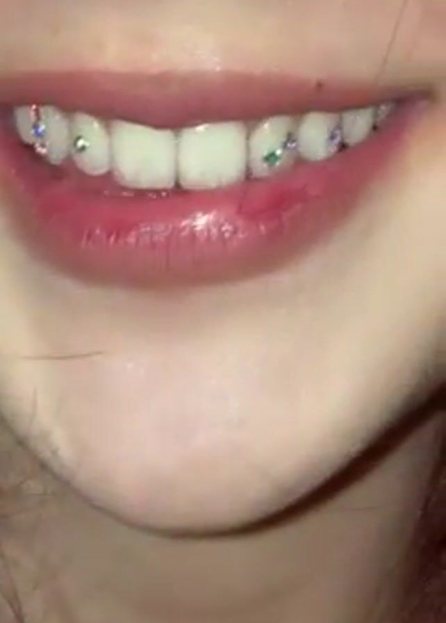 A close-up shot depicts a person smiling, revealing teeth adorned with small, colorful, possibly holographic, gems along the gum line of the lower teeth and sparingly on the upper teeth