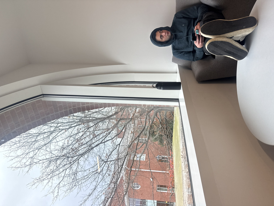 A person wearing a dark hooded sweatshirt sits in a nook beside a large window. They are holding a cell phone. Outside the window, bare tree branches spread across the view of a brick building with several windows. A black water bottle is on the windowsill. The room is painted in neutral colors.