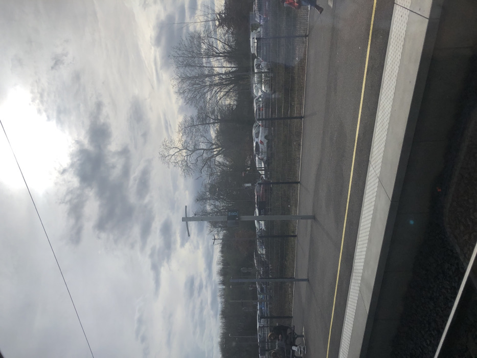 The image depicts a train station platform in Brumath, France, under an overcast sky with visible sunlight