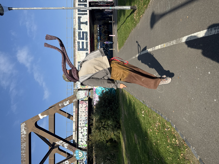 The image depicts an outdoor scene on a clear, sunny day, focused on a paved pathway beneath a railway bridge in London. The location is identifiable as the **Parkland Walk under the Stroud Green Road Bridge** (also known as the Harringay Green Lanes bridge) in North London, United Kingdom, evidenced by the distinctive brown metal truss bridge and concrete underpass extensively covered in graffiti, including the prominent "E DORA MX MXM" on the truss and "PALESTINE" on the concrete wall. A person, positioned slightly left of center, is captured in mid-air, facing away from the camera. They wear a camouflage-patterned cap, a light grey hooded sweatshirt partially unzipped over a beige t-shirt, and two-tone brown baggy trousers. A red lanyard with a white rectangular item hangs from their right hip. From the back of their head/neck, a dark purple/red knitted head covering or accessory with multiple flowing strands extends dynamically, suggesting movement or wind. Their left foot, wearing a grey sneaker, is visible suspended above the path. The person casts an elongated shadow to their right on the pathway. The paved pathway features a faded white dashed line down its center. To the left of the path, there is a strip of green grass and dense green bushes, with scattered brown leaves. To the right, a grey metal lamppost stands in the mid-ground. In the background, underneath the concrete underpass, another individual wearing purple clothing is visible in the distance, walking away from the camera. The multi-colored graffiti covers both the metal truss bridge and the concrete underpass.