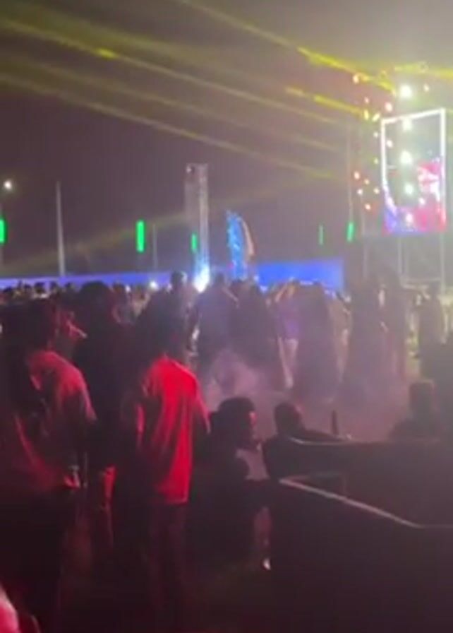 crowd of people at an outdoor concert or festival at night. There is a stage in the distance with a performer on it and a large video screen. The stage is lit with yellow and green lights. The crowd is dense, and many people are standing. A layer of smoke fills the space in front of the stage. The video is shot from a low angle, making it difficult to see the details of the people and the stage.