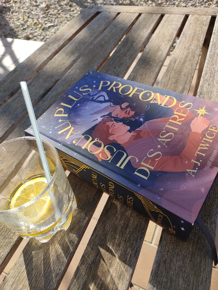 The scene depicts a static, slightly elevated, close-up view of objects resting on a weathered wooden slatted table in an outdoor setting in Aubagne, France. A hardcover book, approximately 24 cm by 16 cm, is positioned horizontally on the table. Its dark blue cover features a starry motif and gold text reading "AU PLUS PROFOND JUSQU'AU DES ASTRES" by "A.J. TWICE" (Gulf stream éd.). The cover artwork illustrates two stylized human figures, one with dark hair and one with reddish-brown hair and glasses, set against a cosmic background. A black fabric bookmark ribbon extends from the lower edge of the book. Adjacent to the book, on the left, is a clear glass, approximately 10 cm tall, with a ribbed lower section. It contains a transparent liquid, two yellow lemon slices, and a white straw with thin blue horizontal stripes. Direct sunlight illuminates the scene from the upper left, casting distinct parallel shadows from the table slats across the wooden surface and from the objects themselves. No individuals are present in the frame.