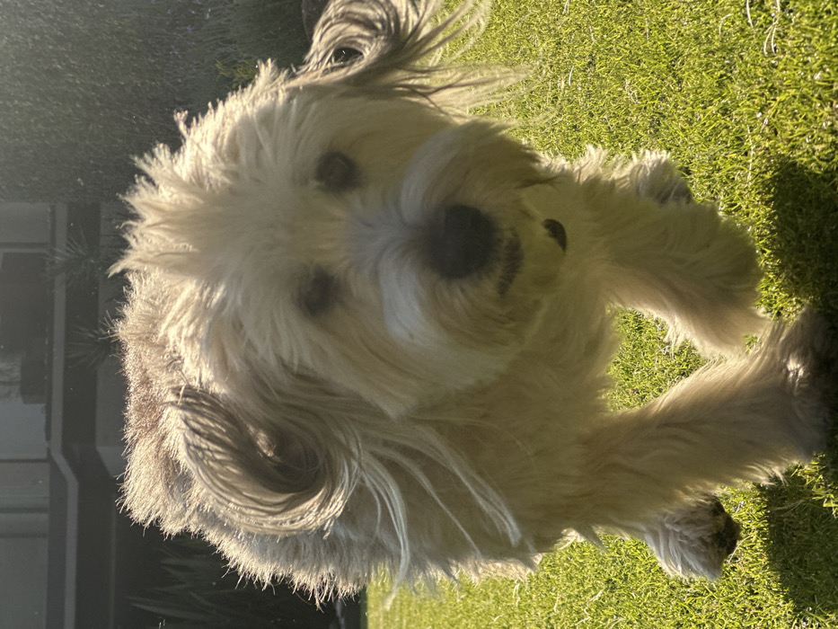 A fluffy, light-colored dog stands on green grass, looking directly at the camera. Its fur is long and shaggy, catching the sunlight. The dog's dark eyes and nose are visible amidst the fur. Part of a building can be seen in the background, indicating an outdoor setting. The lighting suggests it is daytime.