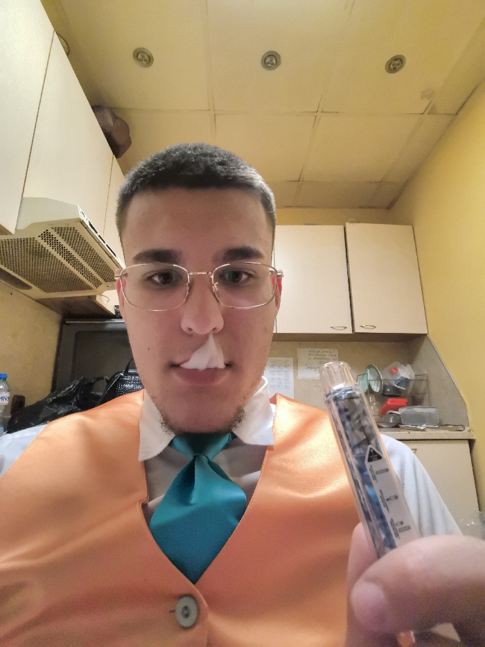 An individual, identified as a young male, is depicted in a medium-shot selfie. He has short, dark hair and wears gold-rimmed eyeglasses. White vapor or smoke is actively exhaling from his mouth. His attire consists of a white collared shirt, a teal necktie, and an orange vest with a single button visible. He holds a clear, cylindrical electronic vaping device in his right hand, extended towards the camera. The device contains internal components and a triangular warning symbol. The background indicates an indoor setting, likely a kitchen or utilitarian space in a residence or commercial establishment in Sofia, Bulgaria. The ceiling is light-colored with visible panel lines and two recessed circular light fixtures. The walls are painted a uniform yellow. To the subject's left, a light-colored overhead cabinet is partially open, revealing a dark object within. Below this, a silver range hood with visible mesh is mounted above what appears to be a dark television or monitor and a blue plastic water bottle. To the subject's right, two closed, light-colored overhead cabinets are mounted on the yellow wall. Below these, a cluttered countertop is visible, displaying various objects including a metal bowl, small kitchen appliances, and clear containers. A piece of white paper with handwritten text is taped to the yellow wall.