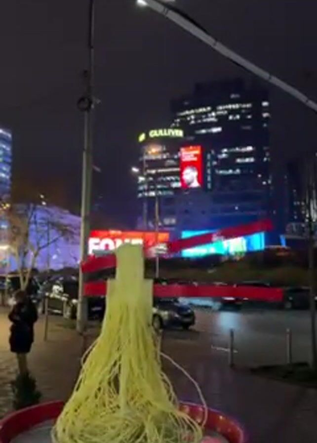 At night in an urban area, a surreal art installation features a column of simulated spaghetti in a red bowl-like fountain
