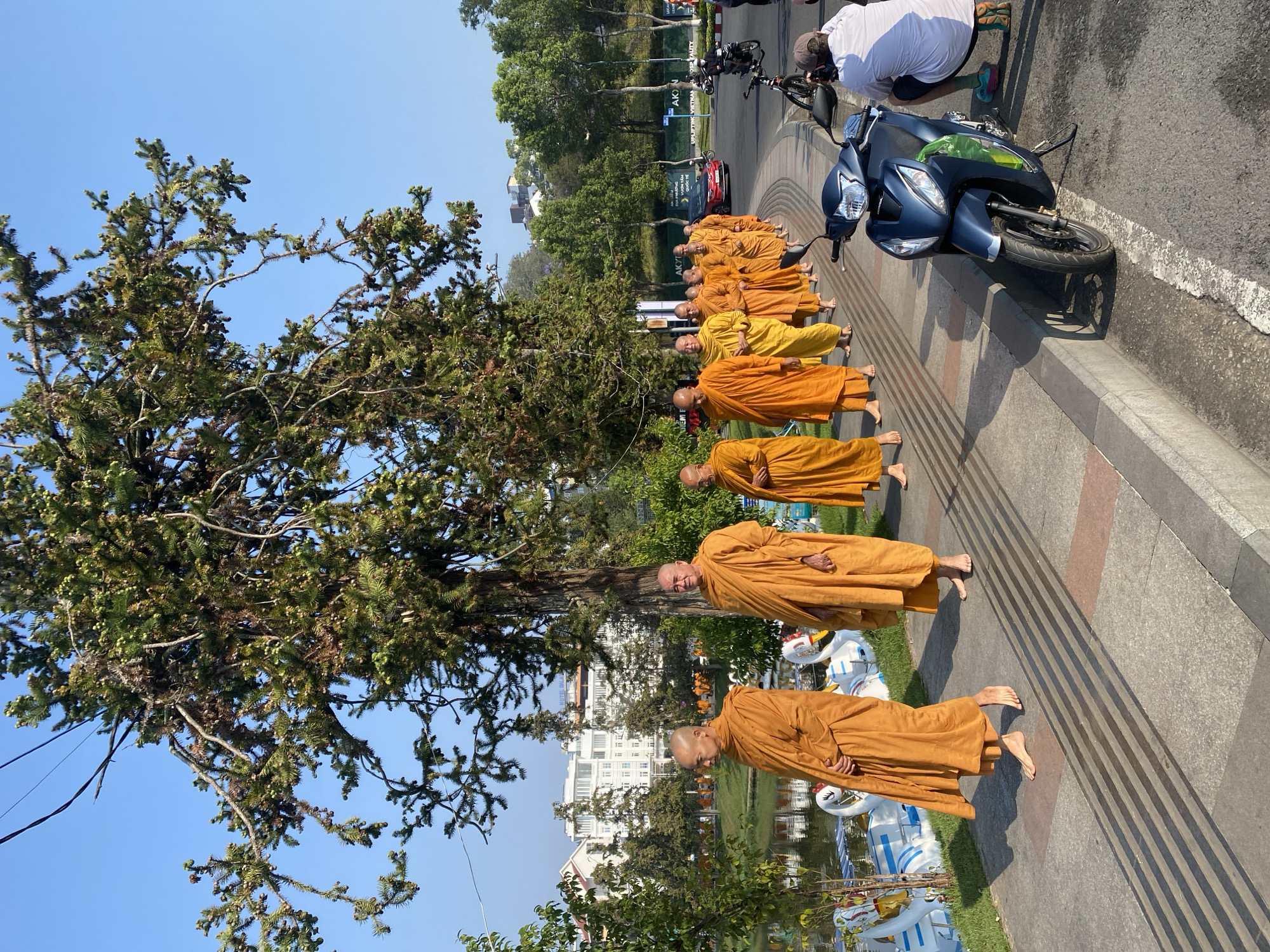 A row of barefoot Buddhist monks wearing saffron robes is walking along a sidewalk next to a street and a tree in Da Lat, Vietnam. A man in a white shirt kneels by a blue scooter on the street side. The sidewalk has a striped pattern. Behind the monks are trees, a lake with swan boats, and buildings. The sky is clear and blue.