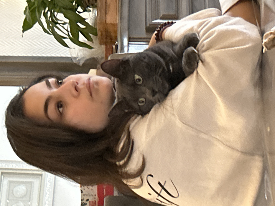 A young female with dark brown hair is depicted in a medium shot, looking towards the viewer's left in a domestic interior in Saint-Quentin, France. She wears a light-colored, long-sleeved garment, possibly a sweatshirt, with a dark, cursive 'f' or similar character visible on her left shoulder. A dark, possibly beaded, bracelet is on her right wrist. Cradled in her arms is a grey, short-haired cat with prominent green eyes, gazing directly at the camera. The cat exhibits a slight white marking on its chest. The background features a white framed object with circular elements and a patterned, possibly wrapped, item on the left. To the right, a dark wooden furniture piece holds a green potted plant in a woven basket, set against a wall with a subtle herringbone pattern wallpaper. A blurred, light-colored surface with a small, irregular object is visible in the lower foreground.