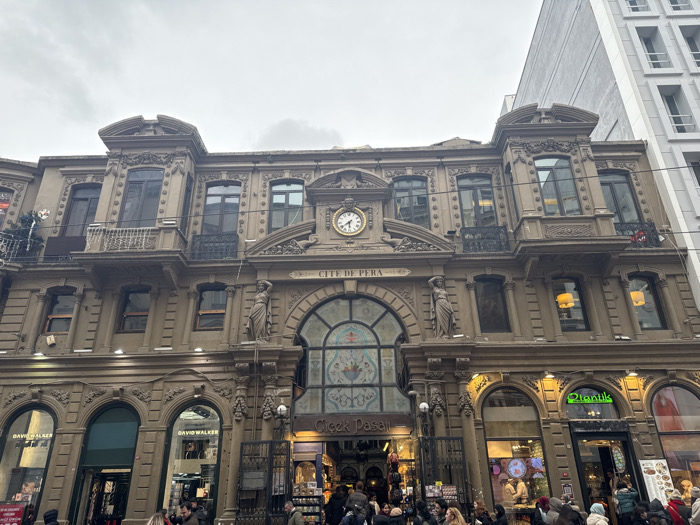 The image displays the ornate Çiçek Pasajı building, situated on Istiklal Avenue in the Beyoğlu district of Istanbul, Turkey