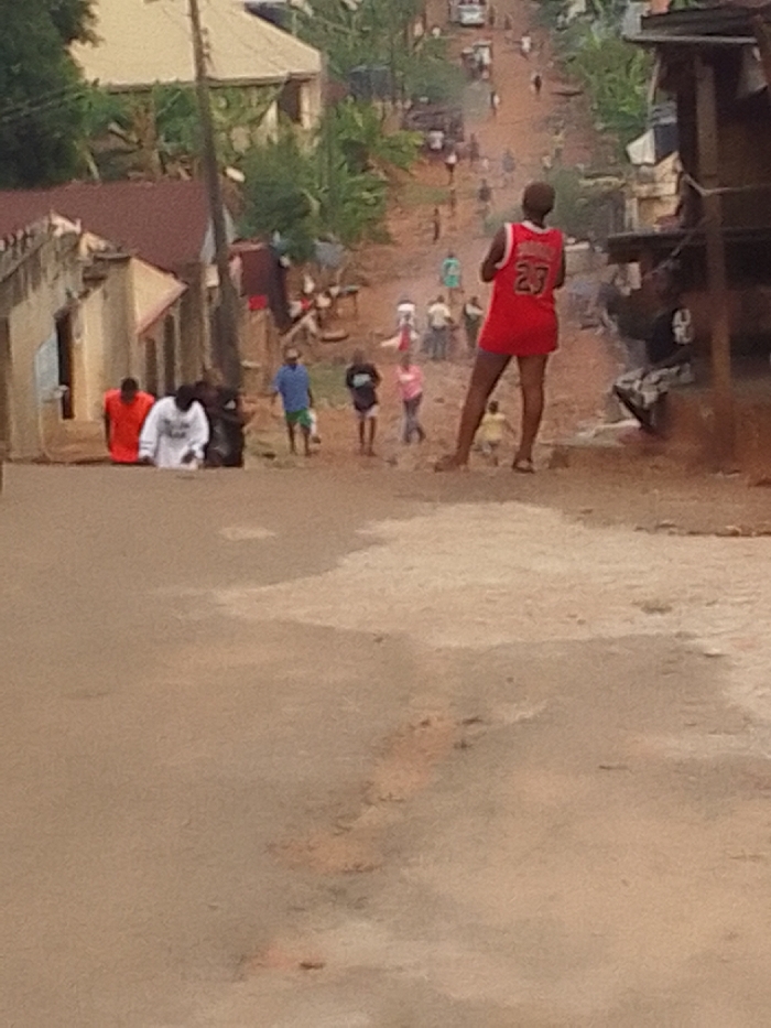 A dirt road scene with a gathering of people. A person in a red jersey with the number 23 stands prominently in the foreground, their back to the viewer. Other figures are scattered along the road, including individuals in blue and pink clothing. Buildings and greenery line the sides of the road, creating a sense of depth leading to a distant vehicle.