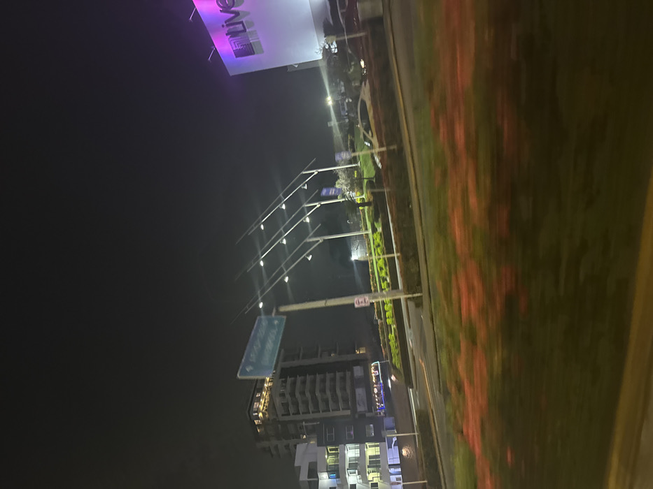 A nighttime cityscape features a high-rise building illuminated with multiple lights. Above it, a green highway sign is partially visible. Adjacent to the road, there's a well-maintained green median strip. Further along, multiple light poles are arranged. A large billboard with the word "Live" in colorful lettering is positioned at the top of the frame. The sky is dark and blurry, suggesting a moving camera.
