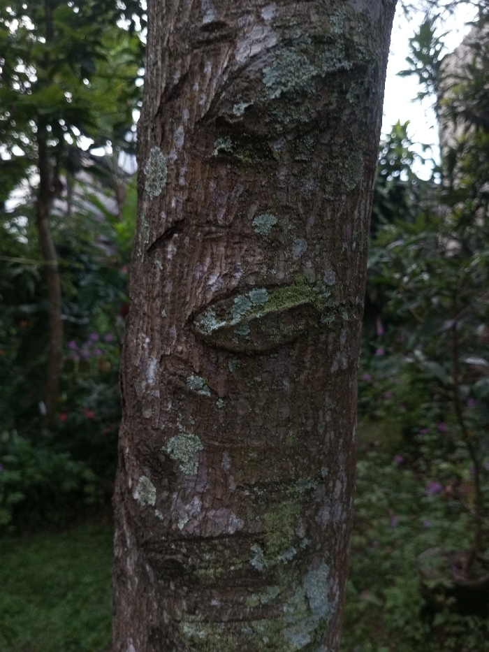 The image presents a vertical, detailed view of a tree trunk located in Ivato, Madagascar. The bark is dark brown, textured with vertical furrows, and covered in scattered patches of light green and grey lichen. Approximately halfway up the trunk, a prominent, horizontally oriented, eye-shaped protuberance is present, also covered with green moss and lichen. The background is out of focus, showing dense green foliage, indistinct trees, and scattered small plants with purple and pink blossoms. The ground visible in the lower left consists of green, low-lying vegetation. No individuals or active interactions are depicted.