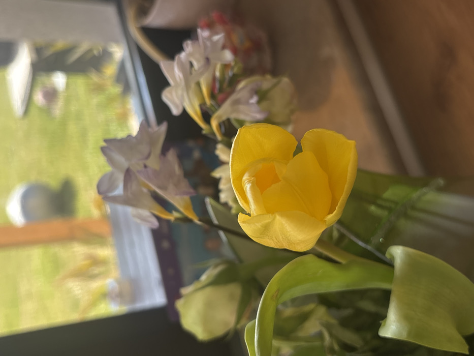 The scene is an interior view located in Dabene, Bulgaria, depicting a floral arrangement positioned near a window. In the foreground, a prominent, partially opened yellow tulip is centered slightly left, exhibiting bright yellow petals and green stem/leaves. Behind it, a cluster of white and light purple freesia flowers with yellow bases is visible, accompanied by a green rosebud on the far left. These flowers are contained within an unseen vessel, likely a vase, with the lower portions obscured. The flowers rest on what appears to be a light brown, possibly wooden, window sill or surface. Through the window, which features a dark frame on the left, an outdoor environment is discernible. This exterior area is characterized by bright green grass illuminated by sunlight. Blurry objects are present in the background, including a light-colored spherical object (possibly a ball) on the grass to the left, and indistinct shapes suggesting garden furniture or structures further right. No individuals are present, and no actions or interactions are depicted. The lighting is natural and bright, with the focus sharp on the foreground flowers and a soft blur in the background.