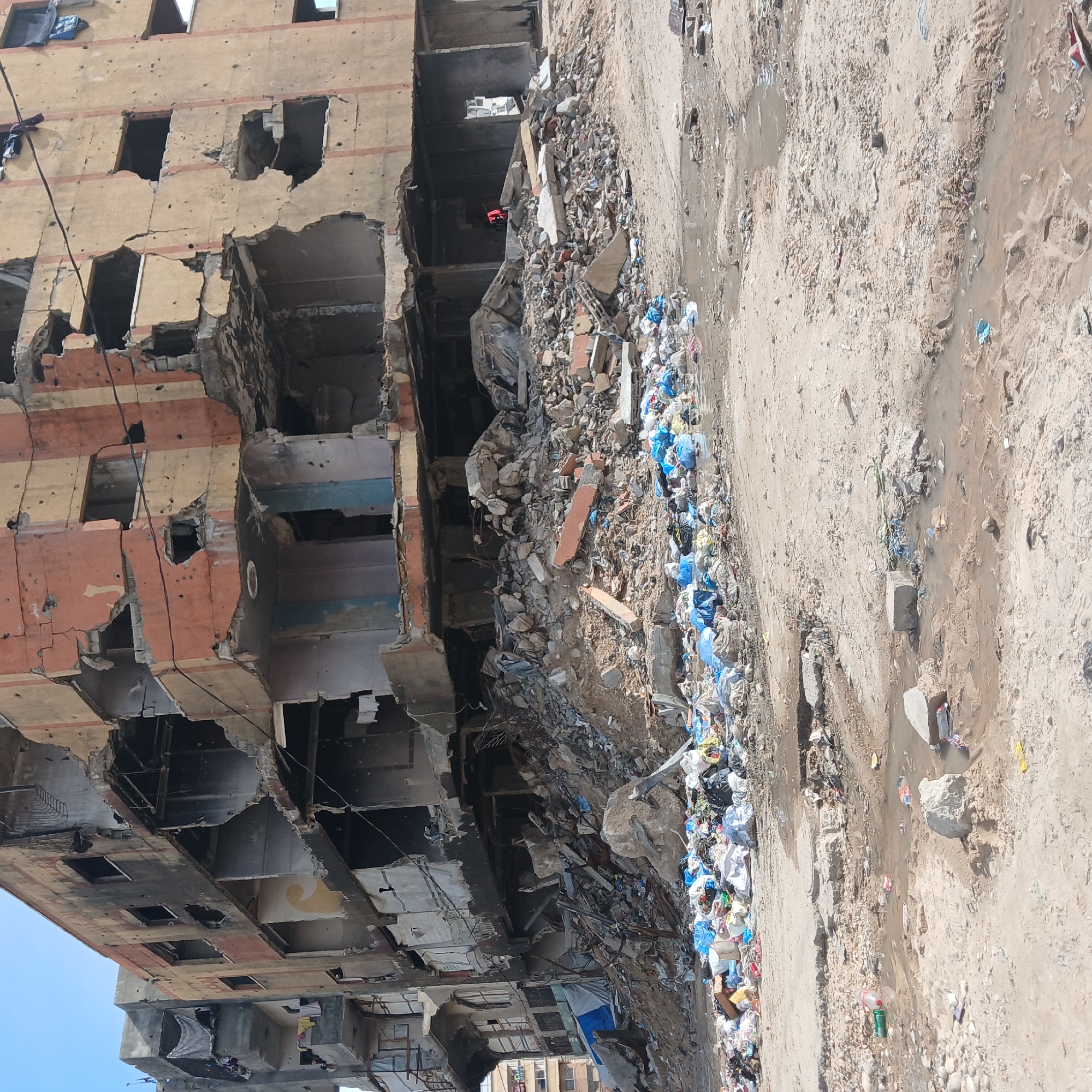 severely damaged building in Gaza, Palestinian Territory. The building's facade is heavily scarred with gaping holes and exposed interiors, indicative of structural damage. Rubble and debris are piled up at the base of the building, spilling onto the adjacent sandy ground. Scattered garbage, including plastic bags and bottles, litters the surrounding area. The sky is visible in the upper left corner.