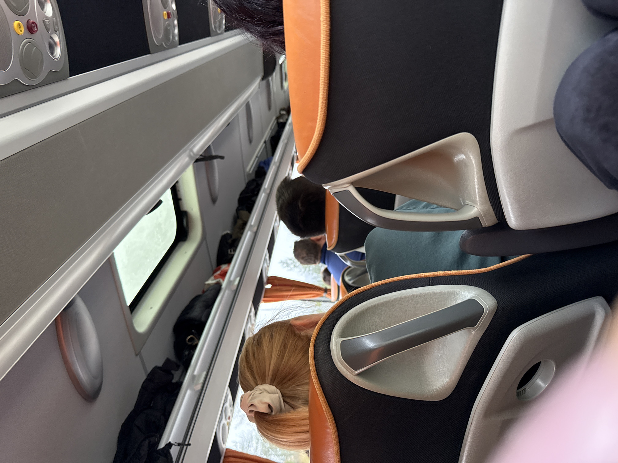 The image depicts the interior of a passenger transport vehicle, identified as operating within Dimitrovgrad Municipality, Serbia, viewed from a seated position looking forward. In the immediate foreground, a partial view of a leg clad in dark trousers is visible on the right, and a blurry pink object is present on the lower left. Directly ahead, two seats are prominent, featuring black fabric upholstery with orange piping along the top and sides, and gray plastic components on the backrests, including a triangular handle-like structure and a circular recess (possibly a cup holder) on the seat closest to the viewer. To the left, the back of a person's head with blonde hair, styled in a ponytail secured by a light-colored scrunchie, is visible. To the right, the back of another person's head with dark hair is seen. Further into the vehicle, multiple additional passengers are seated, primarily visible from behind, including one individual in a blue garment. Above the passenger seating, overhead luggage racks extend along both sides of the aisle, holding various items, primarily dark-colored bags. The ceiling is white, incorporating oval-shaped light fixtures and a central rectangular skylight or emergency hatch. On the right side of the ceiling, above the seats, passenger service units with individual lights, air vents, and control buttons, including a yellow "STOP" button and red alert buttons, are visible. Large rectangular windows line the left side, partially obscured by orange curtains tied back, revealing a blurred outdoor scene with trees under what appears to be an overcast sky.
