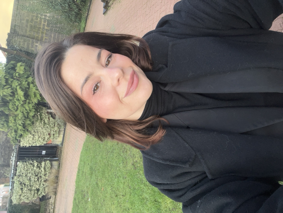 A female individual is depicted in a daytime outdoor selfie, looking directly at the camera with a slight smile