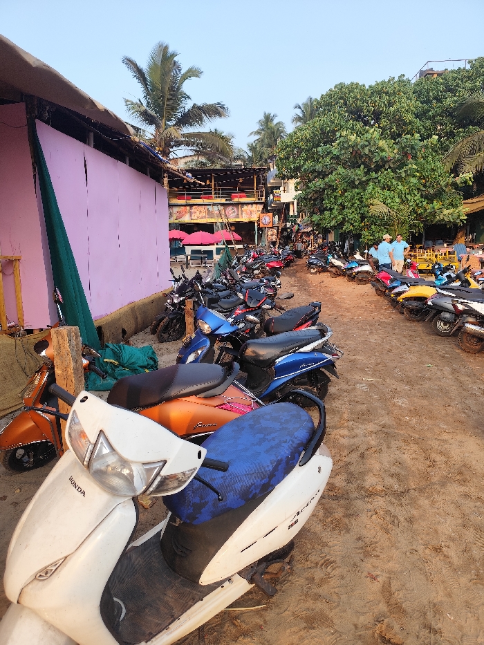 This image depicts an unpaved, sandy pathway functioning as a vehicle parking area in Arambol, India