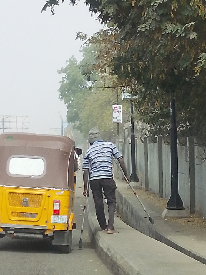 The scene, set in Tarauni, Nigeria, shows a street level perspective featuring a sole individual walking with crutches alongside a three-wheeled vehicle