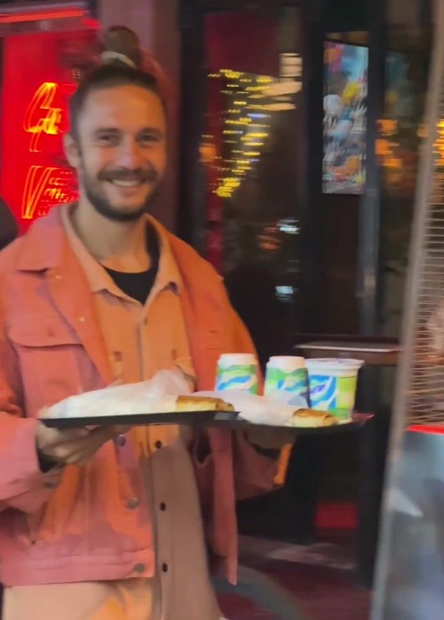 man wearing a pink jacket and with his hair in a bun, standing outside a building. He is holding two trays of food and smiling at the camera. A man wearing a black hooded jacket walks past him. The first man appears to be working at a bar or restaurant, as the establishment is decorated with a red neon sign and a heat lamp. The man appears to be carrying food samples to customers.
