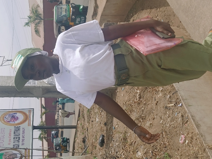 The scene is an outdoor urban streetscape, characterized by bright daylight. A prominent billboard in the background, visible on the left, references "Plateau State" and "GOV. CALEB MUTWFANG" of the "APC FAMILY," indicating the location is in Nigeria, not Gweru, Zimbabwe. In the foreground, a young adult female with dark skin walks forward on a concrete surface, appearing to ascend a slight incline. She wears a white short-sleeved t-shirt, olive green cargo pants secured with a matching olive green belt and buckle, and an olive green baseball cap featuring a white emblem, worn over a white head covering. A thin necklace with a small geometric pendant is visible around her neck, and a light-colored beaded bracelet is on her left wrist. She holds a transparent pink plastic folder containing papers and a dark-colored smartphone in her left hand, positioned against her hip. Her gaze is directed to her right, away from the camera. To the immediate left of the female subject, a barren dirt patch with sparse dry vegetation and scattered litter is visible, separated by a concrete curb. Beyond this, a paved road extends into the mid-ground. On the road, at least two green and yellow motorized tricycles (auto-rickshaws) are present, one clearly displaying "PTA-1917" on its rear, alongside other vehicles. Further in the background, several individuals are discernible; one person in light-colored attire is bent over near the road, and another in a light blue garment stands upright. The distant background features palm trees and low-rise buildings with reddish roofs, under a clear sky. A utility pole is situated on the left, partially obscuring the billboard.