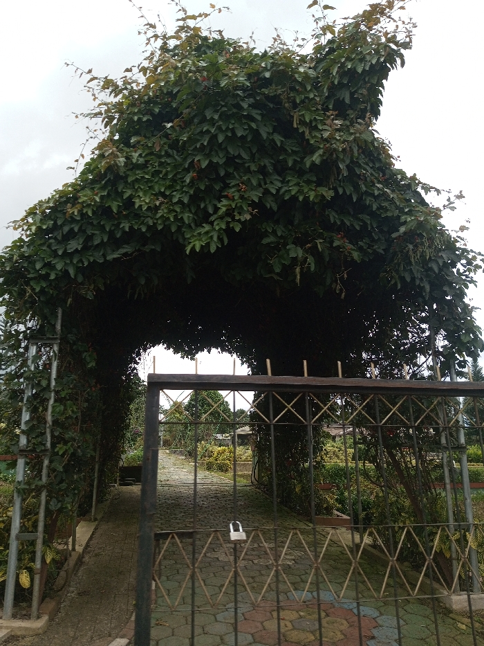 An outdoor scene in Tagtse Tashidingkha, Bhutan, depicts a locked garden entrance viewed head-on under an overcast sky