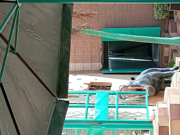 The image presents an outdoor scene within the city of Embu, Kenya, featuring architectural elements and a statue under bright daylight. A dark green outdoor umbrella, showing signs of wear, dominates the upper frame. Below it, a building facade with teal-framed windows and diamond-patterned grilles is visible on the left. A multi-level tiled staircase with alternating brown and beige geometric patterns leads up to this building. Adjacent to the staircase, a dark gray statue of a hippopotamus stands, its mouth wide open, displaying reddish interior and white teeth. To the right, a tall, slender palm tree with a light green trunk and dried fronds rises in front of a red-brick building. A teal door on this brick building is open, revealing a dark interior. Small green shrubs are visible at the base of the palm tree. No individuals are present in the scene.