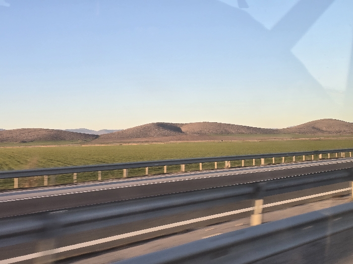 The scene depicts a rural landscape near Polsko Padarevo, Bulgaria, observed from the interior of a moving vehicle, indicated by blurred foreground elements and reflections on an implied window surface. A metallic guardrail, partially blurred, occupies the immediate lower right of the frame. Directly beyond this, a two-lane asphalt highway is visible, featuring a solid white line marking the right shoulder and a broken white line separating the two lanes. A second metallic guardrail runs parallel to the highway's left edge. Beyond the highway and guardrail, an expansive area of vibrant green agricultural fields stretches across the midground, displaying discernible rows of crops. In the distant left-midground of these fields, small, dark, indistinct shapes are present, their specific identification uncertain. The background consists of multiple gently rolling hills covered in light brown and tan vegetation, consistent with dry scrubland or sparse foliage. Further on the horizon, a faint, hazy line of distant blue mountains is visible. The sky is clear, transitioning from a light blue overhead to a pale yellow-white hue near the horizon, indicative of early morning or late afternoon lighting conditions. No human figures or discernible active interactions are present within the captured environment.