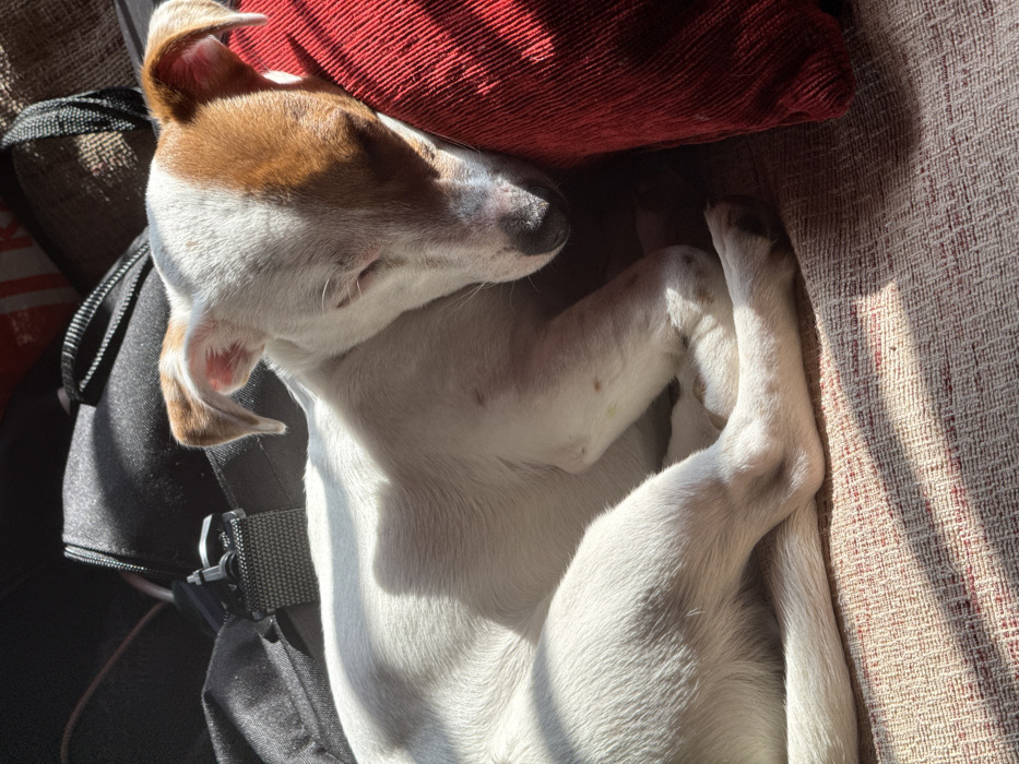 - "A white-furred dog with reddish-brown markings is depicted sleeping in a curled position on a woven fabric surface in Galabovtsi, Bulgaria" by FM-fASGr2, licensed under CC BY 4.0