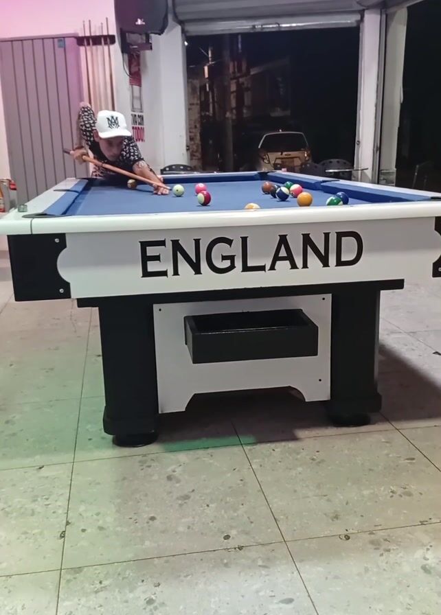 A young man is playing pool on an "ENGLAND" branded billiard table inside a building that looks like a garage or warehouse
