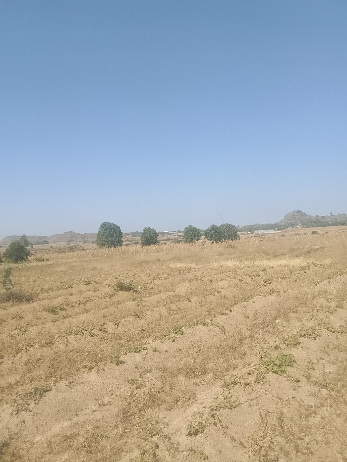 The image displays an expansive agricultural landscape in Jos, Nigeria, under a clear, pale blue sky. The immediate foreground consists of dry, light brown soil with distinct parallel furrows, indicating past or present cultivation. Scattered across this soil are sparse patches of small, green-leafed plants. In the midground, a horizontal row of approximately six uniformly sized trees with dense green foliage stands. Behind this tree line, the terrain extends into fields of dried, yellowish-brown vegetation, likely crop residue. The background features undulating dry hills, several scattered rocky outcrops, and faint distant structures, with a prominent rocky hill dominating the far right horizon. No human figures or active interactions are visible within the frame. The scene is illuminated by bright, unobstructed sunlight.