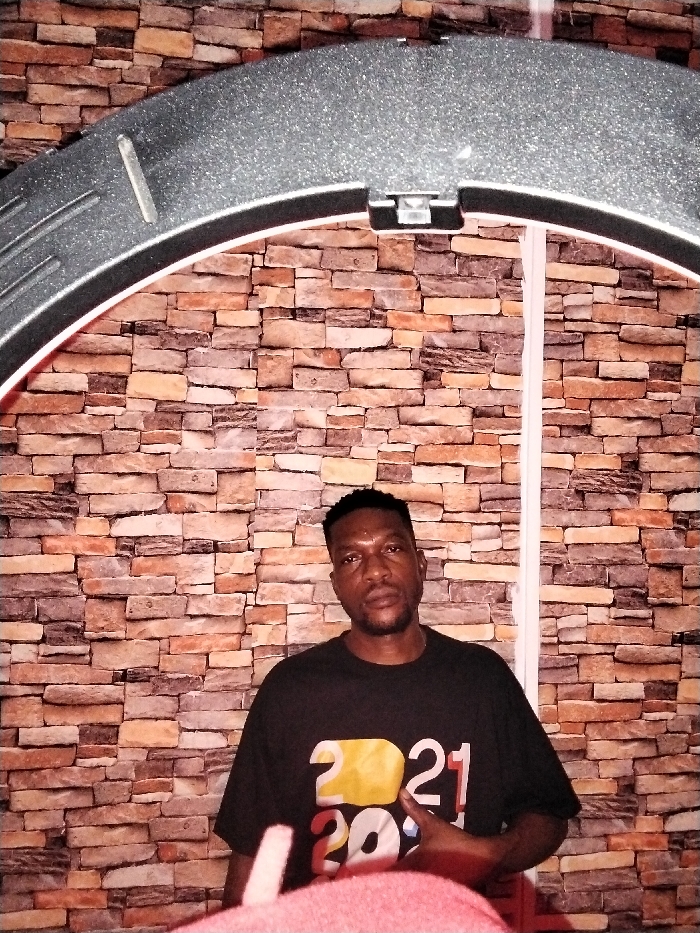 A man stands in front of a brick wall, positioned within the arc of a ring light. He wears a black t-shirt with a colorful "2021" graphic. The background is a textured brick pattern. A white vertical support is visible behind the ring light. The lower portion of the image is obscured by a partially visible, soft pink object.