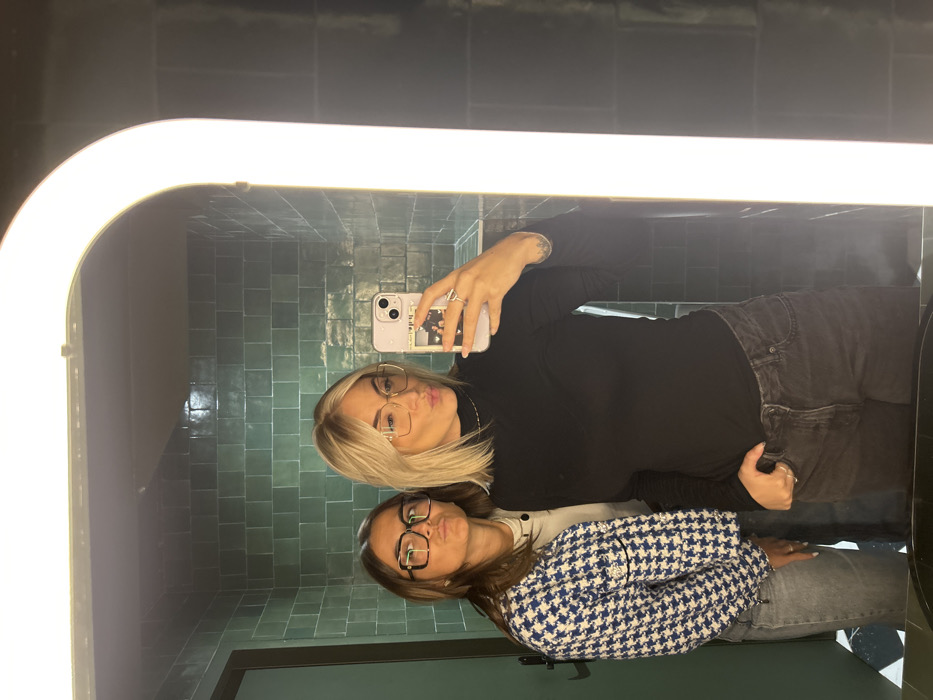 This image depicts a mirror selfie of two women taken in an interior setting within the city of Saint-Étienne, France