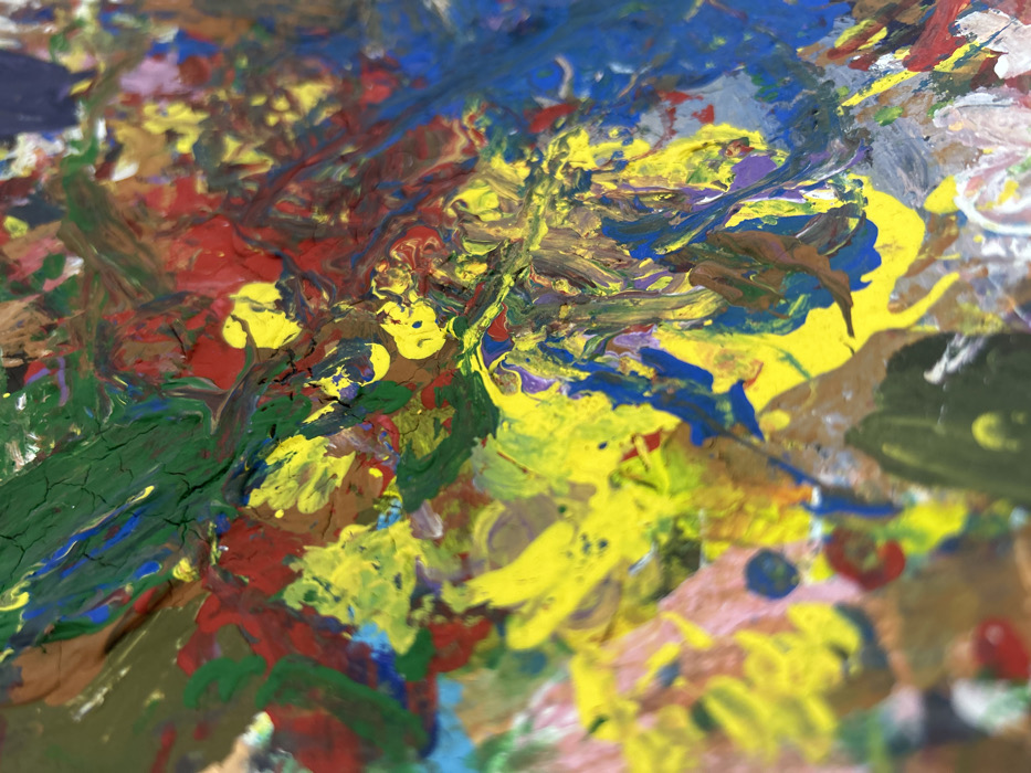 The image displays a close-up, high-angle view of a textured surface covered in an abstract arrangement of thick, dried, and semi-dried paints