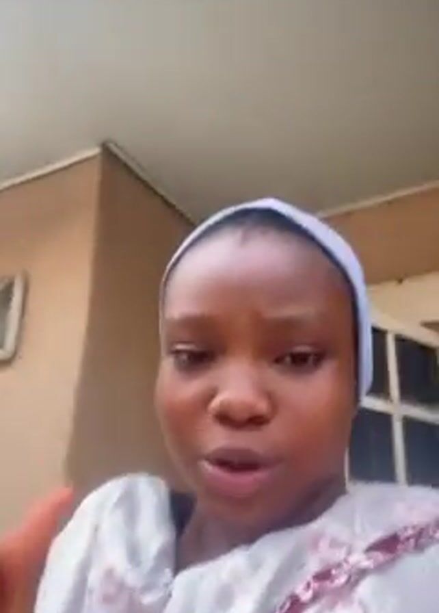 A young woman with dark hair, brown eyes, and dark skin, is recording a selfie video outdoors. She wears a light blue headband and a white shawl patterned with pink and gray flowers. Her facial expression is neutral as she speaks directly into the camera. Behind her, a tan exterior wall is visible, along with a small window with a white frame. A decorative light fixture hangs on the wall near the window. The video appears to be taken during the daytime.