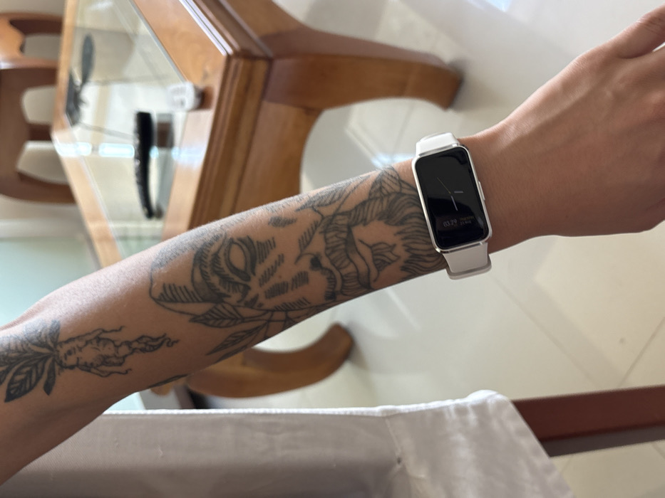 The image captures a close-up of a person's left forearm and hand, adorned with tattoos and a smartwatch, set within an indoor residential environment, consistent with a living room in Cali, Colombia