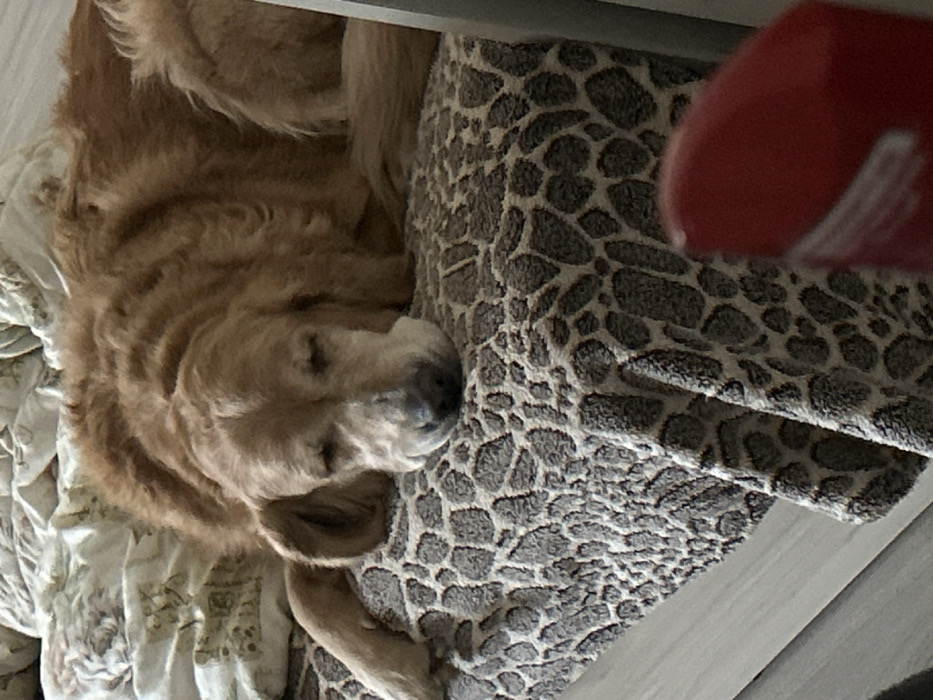- "An adult golden retriever dog is depicted lying on a bed or sofa, its eyes closed, indicating it is asleep or resting" by FM-IOc0r2, licensed under CC BY 4.0