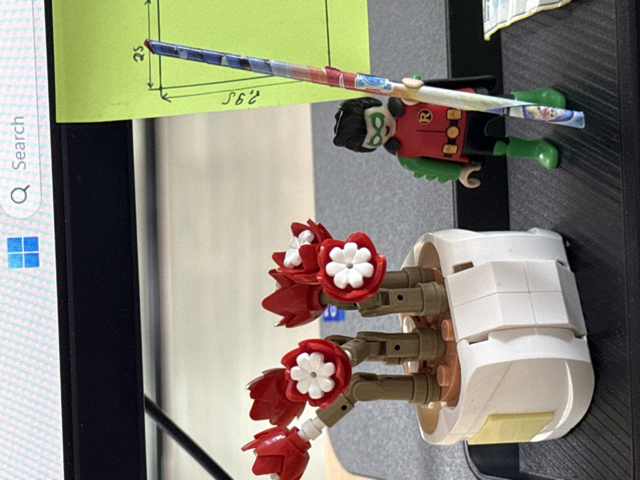 Lego flower arrangement with red petals and white centers. A Lego Robin figurine rests on a colorful, wrapped tube extending from a sticky note with measurements. The arrangement sits in a white, brick-built container, placed on a dark surface near a computer screen.