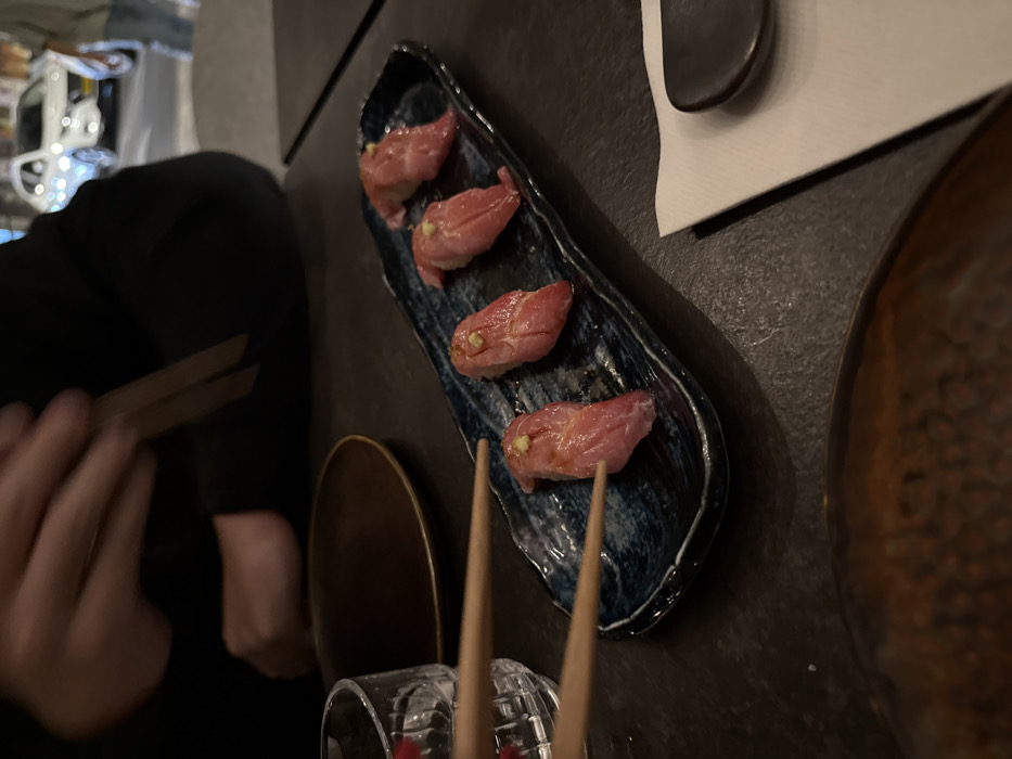 The image captures an indoor dining scene, likely a restaurant, located in an unknown urban city. A person's left arm and hand are visible in the foreground, holding light wooden chopsticks poised to pick up food. On a dark tabletop, a dark blue, rectangular ceramic plate displays four pieces of nigiri sushi, each consisting of thinly sliced raw red meat draped over rice, topped with a small quantity of light green paste. To the left, a clear glass with a textured surface holds water, alongside a round, dark brown plate. A white folded napkin and a small, dark, irregular-shaped dish are positioned on the right. The background, blurred, reveals an outdoor street scene with a white vehicle and other indistinct objects, indicating an urban environment.
