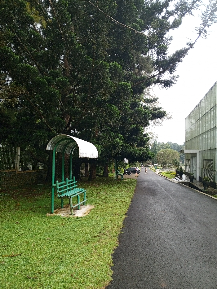 A lush green lawn hosts a shaded bench along a park road. A large, dense evergreen tree provides a backdrop. Further down the road, a modern building with a glass facade stands beside the path. In the distance, other trees and greenery are visible, suggesting a well-maintained park or garden. Several people are walking along the road. The road is dark and looks wet, possibly after a rain.