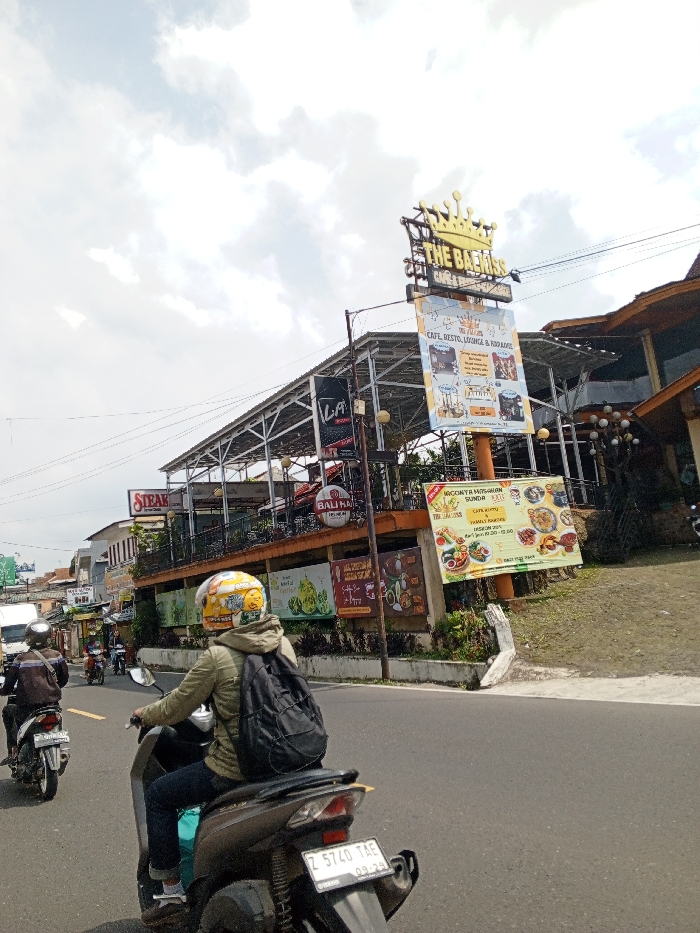 The scene depicts a daytime street view in Multhan, India, under an overcast sky. In the immediate foreground, a person is operating a dark grey or black scooter, viewed from behind. The rider is wearing an olive-green hooded jacket, blue jeans, a black backpack, and a yellow helmet adorned with cartoon-like graphics. The scooter's rear license plate displays "Z 5740 TAE" with a date "09-29". The asphalt road, which appears dry, extends into the background, with a partial yellow line visible on the left side. Further down the road, another individual on a white scooter is visible, wearing a dark jacket and a grey helmet. Additional motorbikes and a white van are partially visible in the distant background, indicating active traffic. On the right side of the road, a prominent multi-level commercial building dominates the view. The upper section features an open-air structure supported by metal framework. A large sign with a golden crown motif at the top displays "THE BAERISS CAFE, RESTO, LOUNGE & KARAOKE." Below this, a large vertical banner advertises "THE BAERISS" with images of food and beverages. A horizontal banner further down promotes "KUGONNYA MITSAROWAN SUNDOR" with various food photographs. Other signs visible on the building include "BALI KAI" and multiple rectangular banners at ground level depicting avocados and other advertisements. On the left side of the street, a row of buildings, including shops and eateries, lines the thoroughfare. A red sign prominently displaying "STEAK" is visible on one of these buildings in the mid-ground, and another sign with "LA" is visible on an upper level structure. Overhead utility wires traverse the scene against the cloudy sky. Sparse green vegetation is visible along the roadside and adjacent to the buildings.