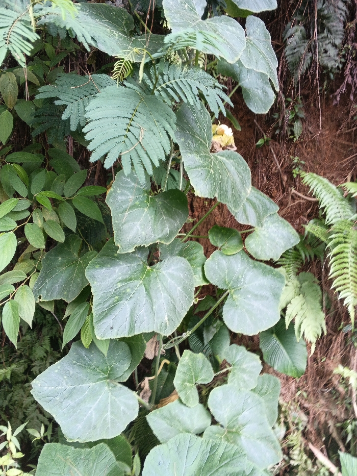 This image depicts a dense, natural vegetative scene in Buyantashi, Zambia. The foreground and midground are dominated by various green plant species. Prominently featured are large, broad, cordate-shaped leaves of a vine-like plant, exhibiting a dark to medium green hue, with some lighter green mottling or veins visible. Interspersed and growing above these are multiple fronds of a plant with finely compound, feathery leaflets, appearing lighter green to bluish-green. To the left, a cluster of smaller, ovate, dark green leaves is visible. On the right side, particularly in the middle and lower sections, are several fronds of ferns. Behind the vegetation, a reddish-brown earthen surface is visible, consistent with exposed soil or a dirt embankment. A single small, yellowish, possibly floral or fruiting object is partially discernible amidst the broad leaves in the upper-mid right section. No people, animals, or man-made objects are present in the scene.
