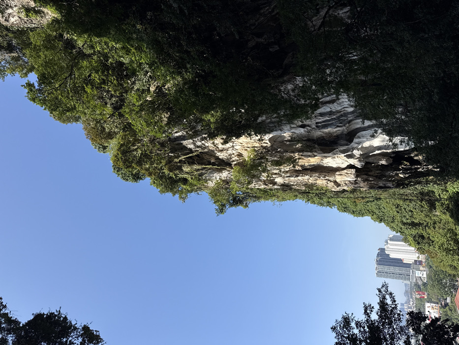 A dramatic, tilted view showcases a rocky cliff face adorned with lush green vegetation. The layers of the cliff reveal variations in color and texture. Below, a clear blue sky extends towards buildings in the distance, framed by more trees. The juxtaposition of the natural cliff and the distant cityscape creates an interesting contrast.
