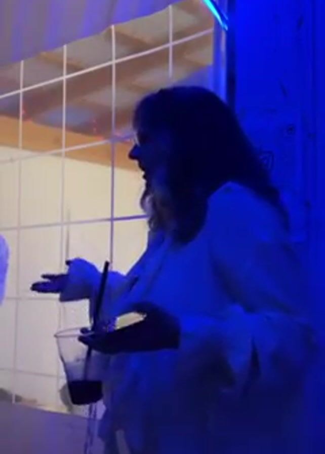 A woman with curly hair and wearing glasses and a white shirt stands in front of a window, illuminated by blue light. She gestures with her hands while holding a clear plastic cup with a dark liquid and a straw in it. A neon blue light fixture is mounted on the wall above her. A white curtain hangs behind the window, which has a grid pattern. A QR code is visible on the wall to her right.