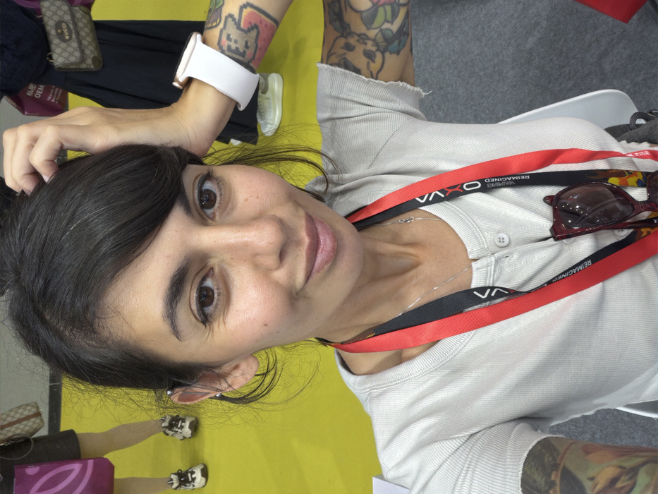 A woman with dark hair and eyes, wearing a light-colored, ribbed short-sleeved top, smiles directly at the camera. She has a silver necklace and a red and black "VIAXO REIMAGINED" lanyard around her neck, from which red-framed sunglasses are suspended. Her left arm is heavily tattooed with colorful designs, and she wears a white smart watch on her left wrist. Her right hand is positioned at the back of her head. The background features a bright yellow floor, with the lower portions of other individuals visible. One person is seen wearing light stockings, brown sneakers, and carrying a purple bag. Another individual, partially obscured, wears dark clothing, light sneakers, and carries a beige Gucci shoulder bag. A grey carpeted area is visible in the lower right. The scene takes place indoors, within an event or exhibition environment in Haizhu District, China.