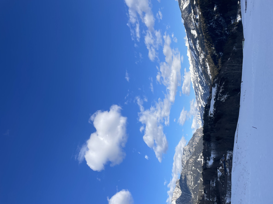 A vibrant blue sky filled with scattered cumulus clouds dominates the scene. Below, snow-covered mountains rise sharply, dotted with trees and glimpses of structures. Patches of white snow extend into the foreground. The image is oriented sideways, revealing a clear contrast between the bright sky and the rugged mountainous landscape.