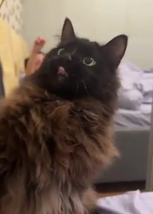 A medium shot shows a long-haired, dark brown and black cat sitting upright on a light purple bedspread. The cat's gaze is directed upwards as a yellow string is lowered into its view. The cat attempts to catch the string with its paws and mouth. A person is lying in the background on the bed, out of focus. The room is lit with a warm light, and the walls are a light color with a patterned design. The furniture in the room is minimal, with a portion of a bed visible in the background.