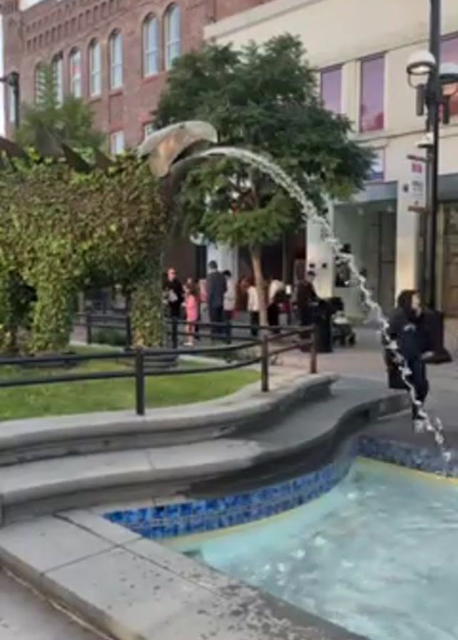 fountain in an urban environment. The fountain features a life-sized dinosaur sculpture, covered in greenery, spouting water into the pool. People stand nearby observing the fountain. Buildings are visible in the background, with shops on the ground level. Pedestrians stroll on the sidewalks.