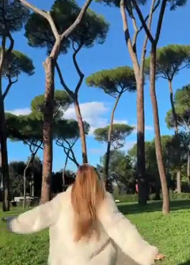 A woman in a white jacket is the focal point of a video, standing on a narrow path in a grassy park. The camera captures her from the back as she twirls, her long, straight, blonde hair flowing. Towering pine trees surround her, their umbrella-shaped canopies providing a backdrop of green against a clear blue sky. The path is sparsely graveled. The woman turns to face the camera and smiles briefly.