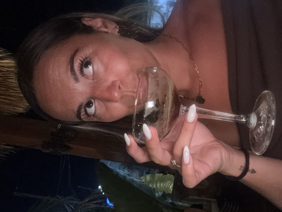 A young adult female is depicted at night in a bar or restaurant in Uluwatu, Indonesia. She is shown in the act of drinking from a clear stemmed coupe glass, holding it with her left hand. The glass contains a dark, foamy beverage. She has light brown hair, a tanned complexion, and is looking upwards and to her right. Her fingernails are painted white in an almond shape. She wears a dark, possibly off-the-shoulder, top, a thin gold-colored chain necklace with a circular pendant, and gold-toned earrings. A ring is visible on her left ring finger, and a black elastic hair tie is on her left wrist, above a small tattoo of stacked hearts. The background elements include a thatched roof, a wooden structural beam, and indistinct dark foliage under a night sky with faint artificial lighting.