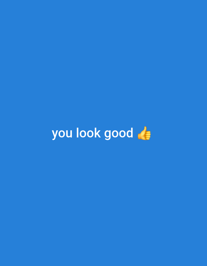 The image displays a solid, uniform blue background. Centered horizontally and slightly above the vertical midpoint, white sans-serif text reads "you look good." Immediately to the right of this text, a yellow-orange skin-toned emoji depicting a thumbs-up gesture is present. No other subjects, objects, or environmental features are visible within the frame. The location is Unknown, Unknown.