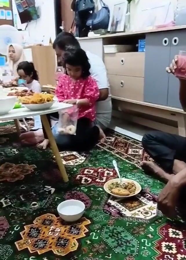 family enjoying a meal together on a carpet in what appears to be a living room. Several individuals are seated around a low table with food. There are two young girls and at least two adult women wearing hijabs. One man is visible, sitting beside a young girl wearing a pink patterned shirt. Another man can be seen on the right, holding a pink beverage. The table holds plates of food, bowls, and drinks. The carpet is colorful and patterned, with geometric designs. Behind the family, there is a cabinet with drawers and shelves, decorated with small objects. A door is visible in the background, along with other furniture and personal items, such as bags hanging from a hook. A fan is visible in the distance. The family seems to be engaged in a relaxed, communal meal.
